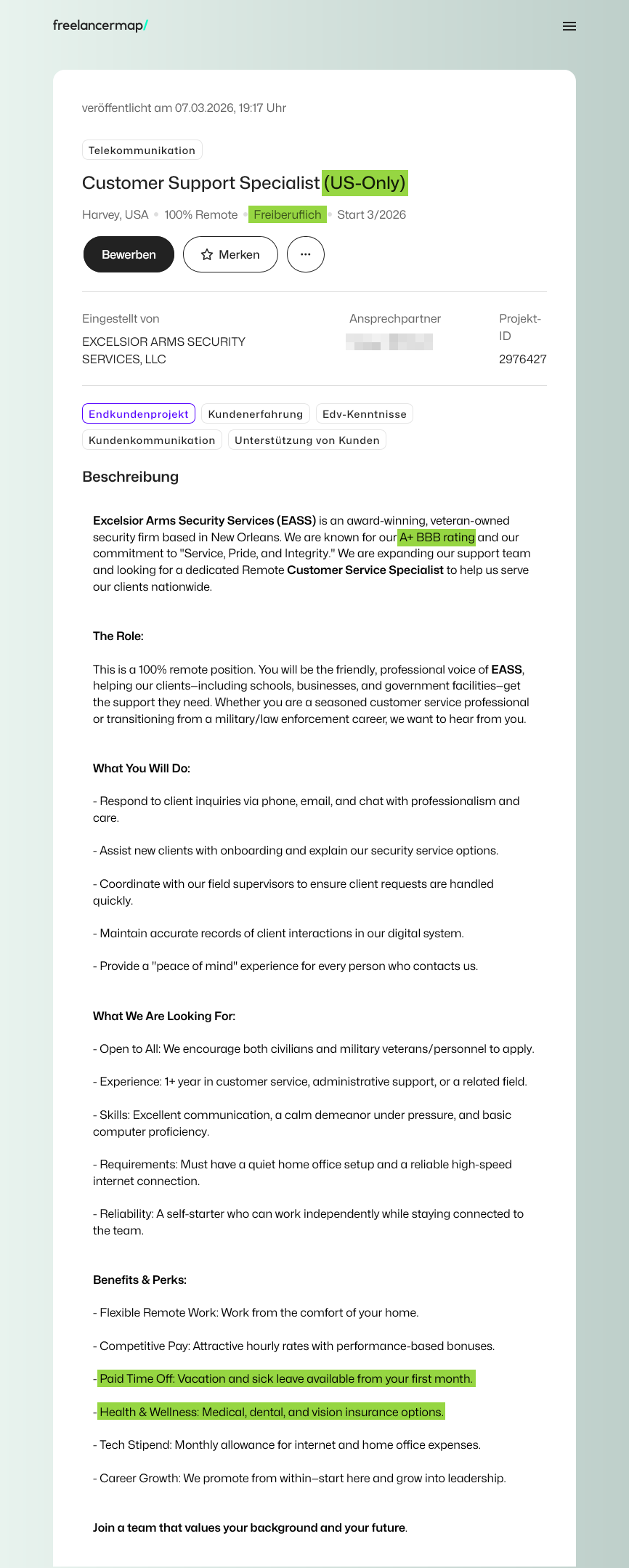 Gesucht wird US-Only, Freiberuflich, aber man darf dann auch Krankheitstage haben und kann sich versichern lassen.