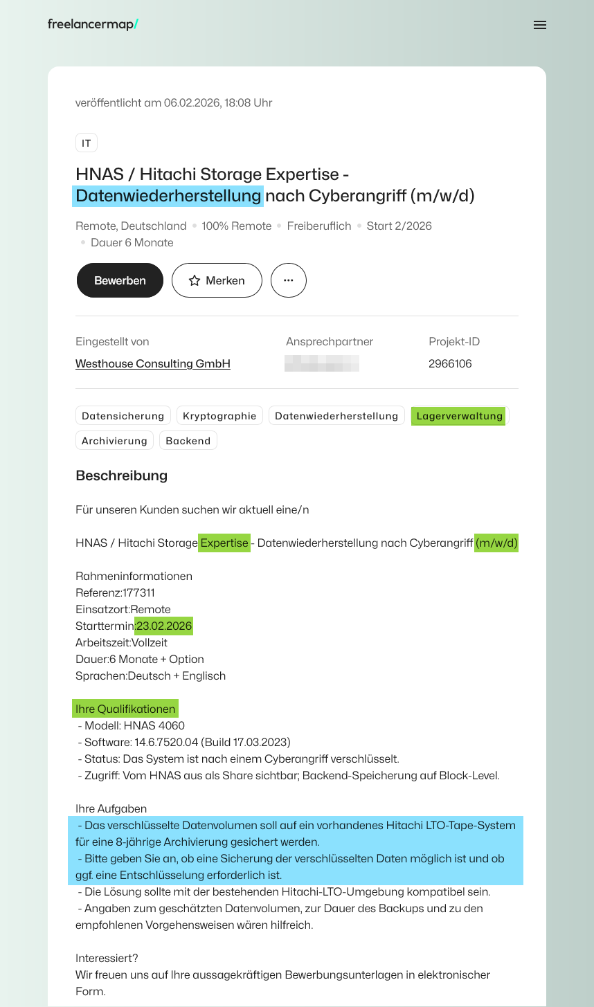 Hier wartet eine Organisation darauf, dass eine Person mit der entsprechenden Expertise Hilfe nach einem Cyberangriff leistet. Dabei muss sehr präzise und sehr sorgfältig gearbeitet werden. Es wäre irgendwie schön, wenn auch die Anfrage nach einer solchen Person Präzision und Sorgfalt erkennen ließe...