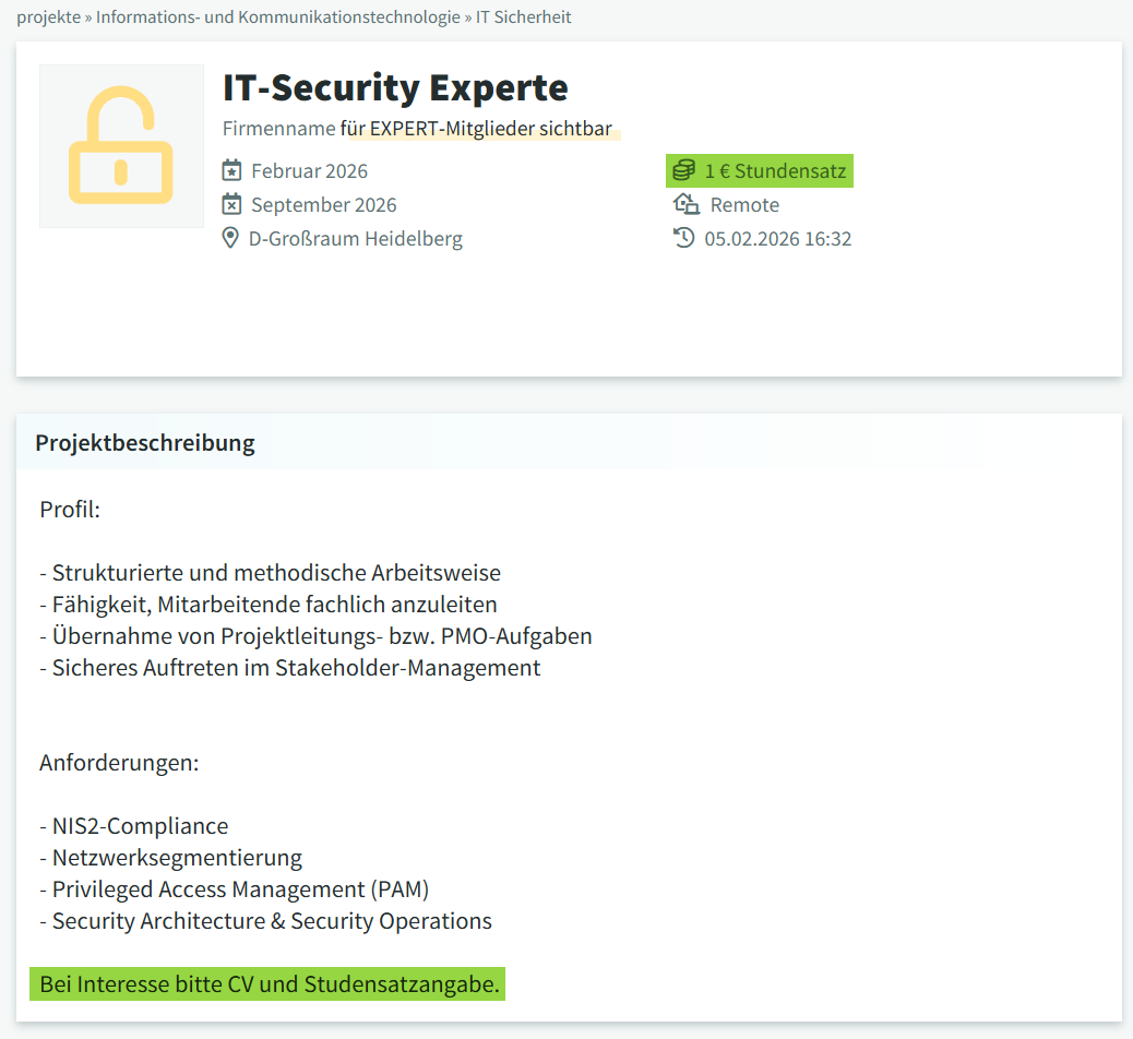 Wer bisher dachte, die Stundensätze für Freiberufler im IT-Bereich hätten schon einen historischen Tiefstand erreicht, der hat diese Anfrage noch nicht gesehen: