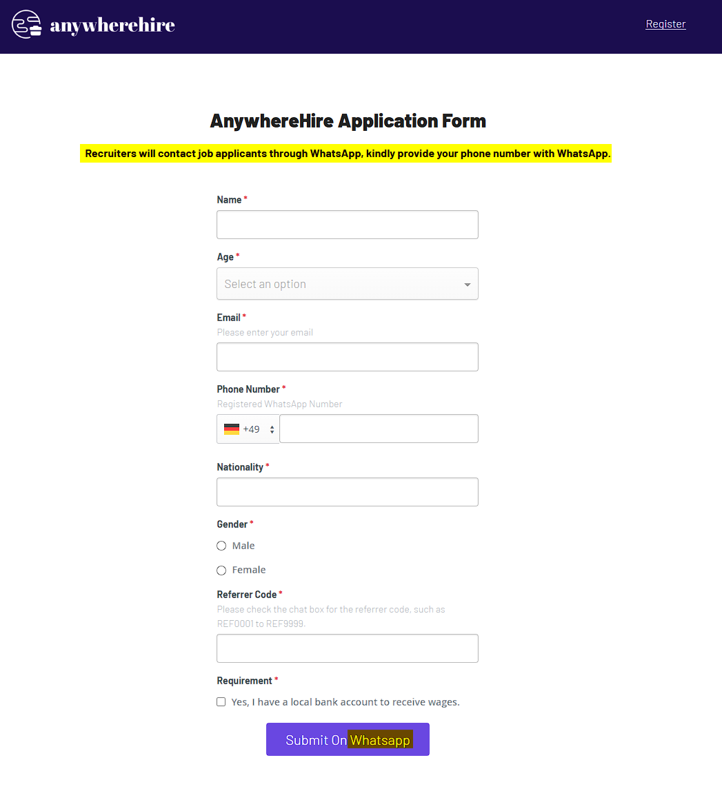 Aber es geht auch gleich seriös weiter: wenn man Tell me More klickt, darf man seine Daten erfassen. Und die werden dann über das datenschutzfreundlichste System gesendet, dass man sich für diesen Zweck vorstellen kann: WhatsApp...